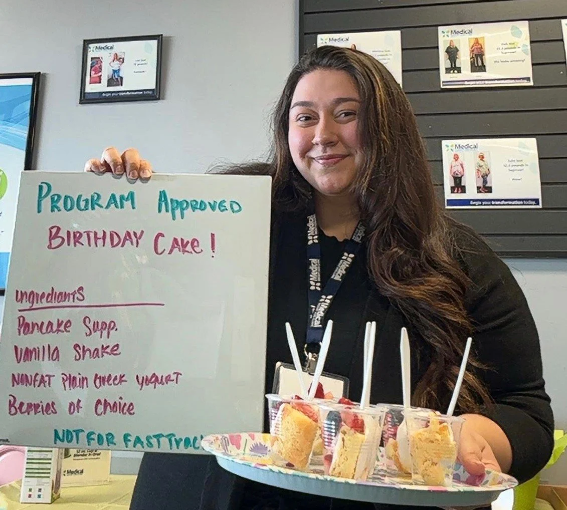 Combine the plain greek yogurt with the remaining vanilla pudding shake to create the "frosting". Frost the cake and top with 1 serving of your choice of berries!